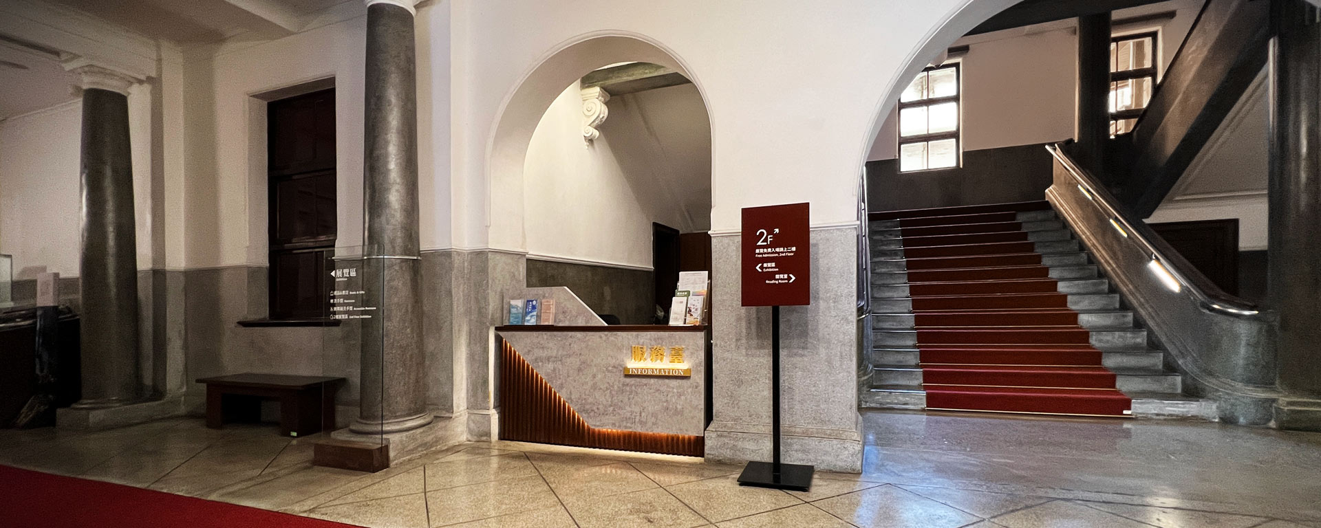 - 在這座始建於1921年、完成於1924年的日治時代古蹟建築中,新設的服務台巧妙融合了木質和石材元素。這不僅呼應了建築的歷史底蘊,也注入了現代簡潔風格,斜切線條和木格柵設計,搭配精心安排的光影,呈現出一種簡約俐落的視覺效果,讓人在踏入這座歷史建築時,能感受到全新的氛圍與活力。