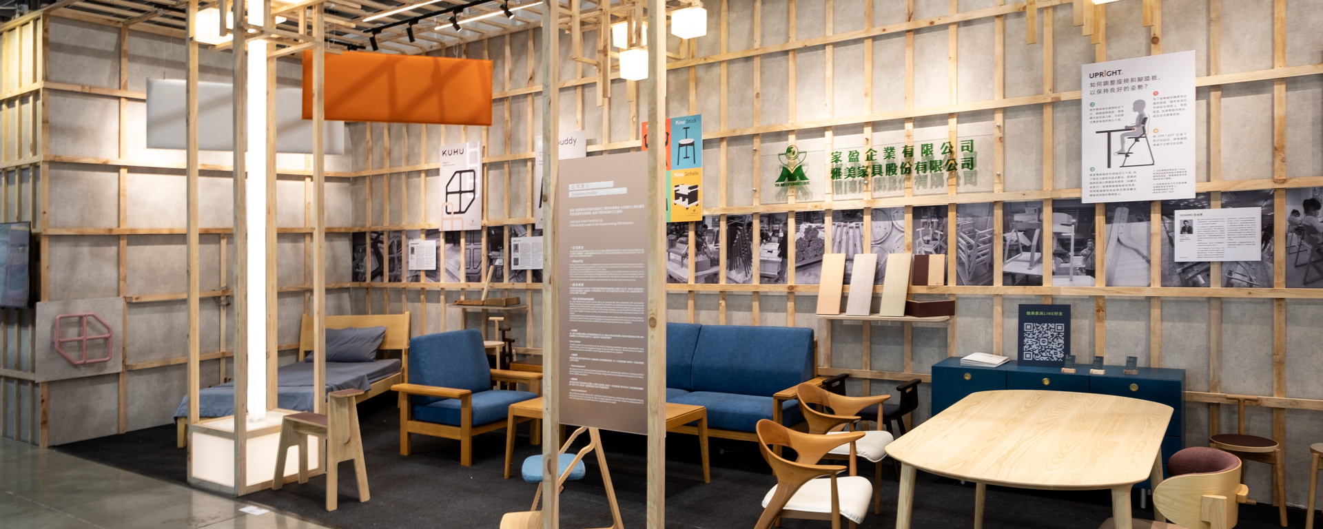 這次為雅美傢俱首次參加建築展的展區攤位,主體以木構設計營造溫暖自然的日式氛圍,並運用堆疊與消隱手法增添空間的立體感和層次感。穿透性燈具提供柔和照明,增強傢俱在展場的和諧感。展區中的木工榫接技法模型與上方面料懸掛,如同和式暖簾(のれん)。透過這些設計元素,參觀者可感受雅美傢俱如日本職人般的工藝精神,以及木製傢俱所展現的質樸與高雅。