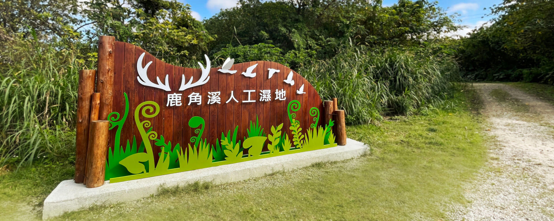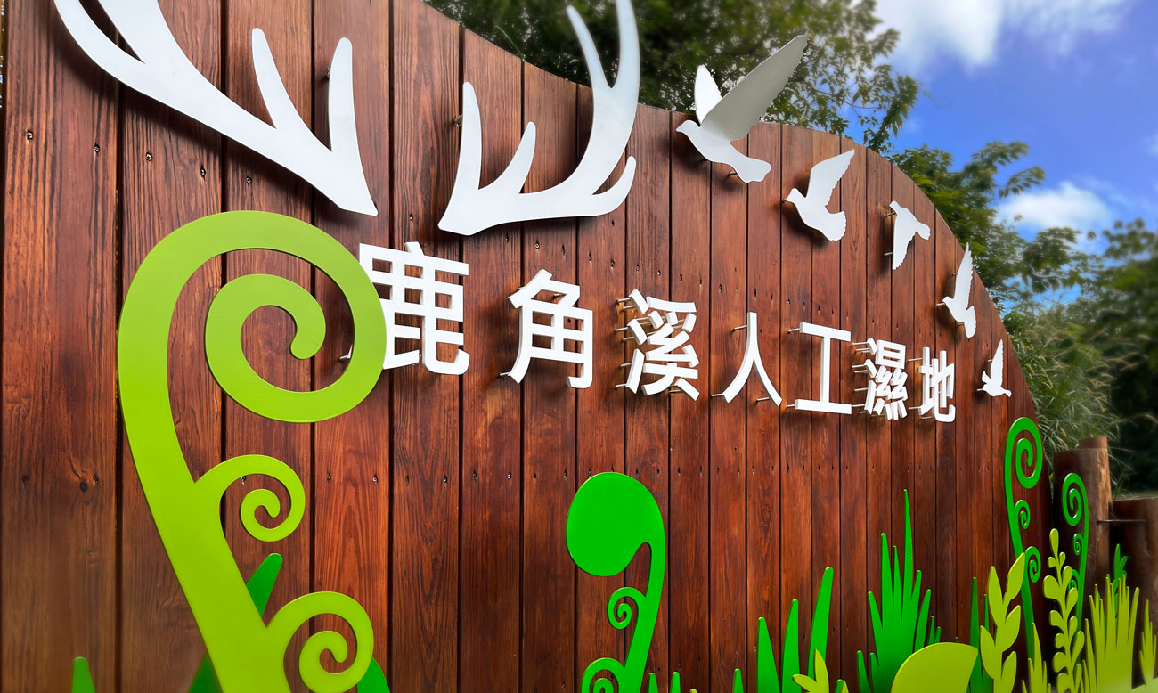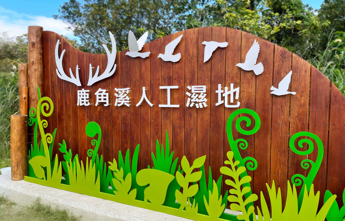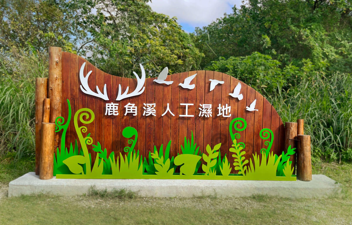 - 人工濕地豐富的環境生態美景為設計發想,將池塘中夏荷、厥類、蘆葦、香蒲等水岸植物以剪影呈現,珍稀的鳥兒展開翅膀,各自不同飛行的姿態流線飛向天際線,入口原木裝置呈現樹林、水生植物及飛鳥在一起的美好意象,寧靜等著來訪的每一個人走入大自然。