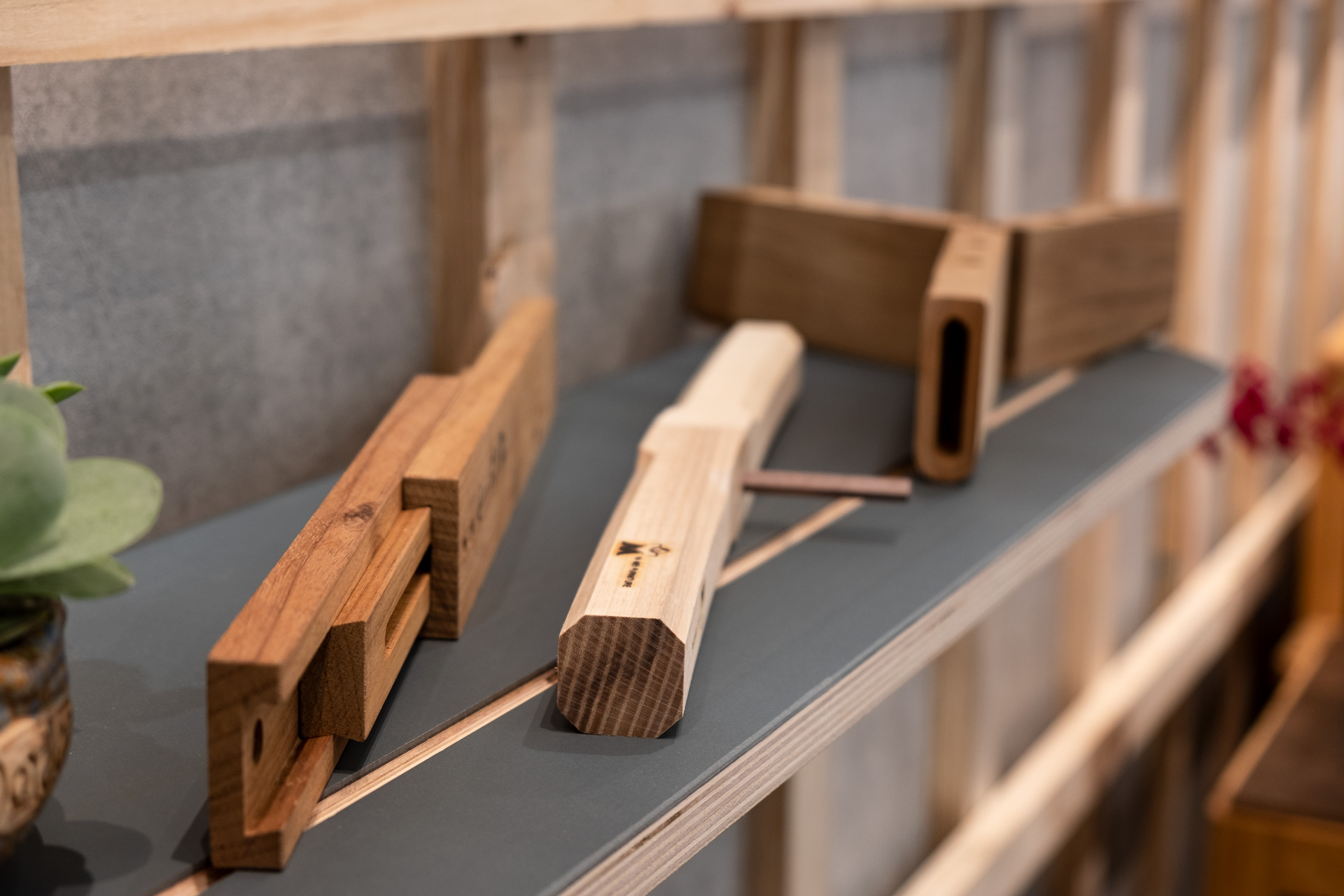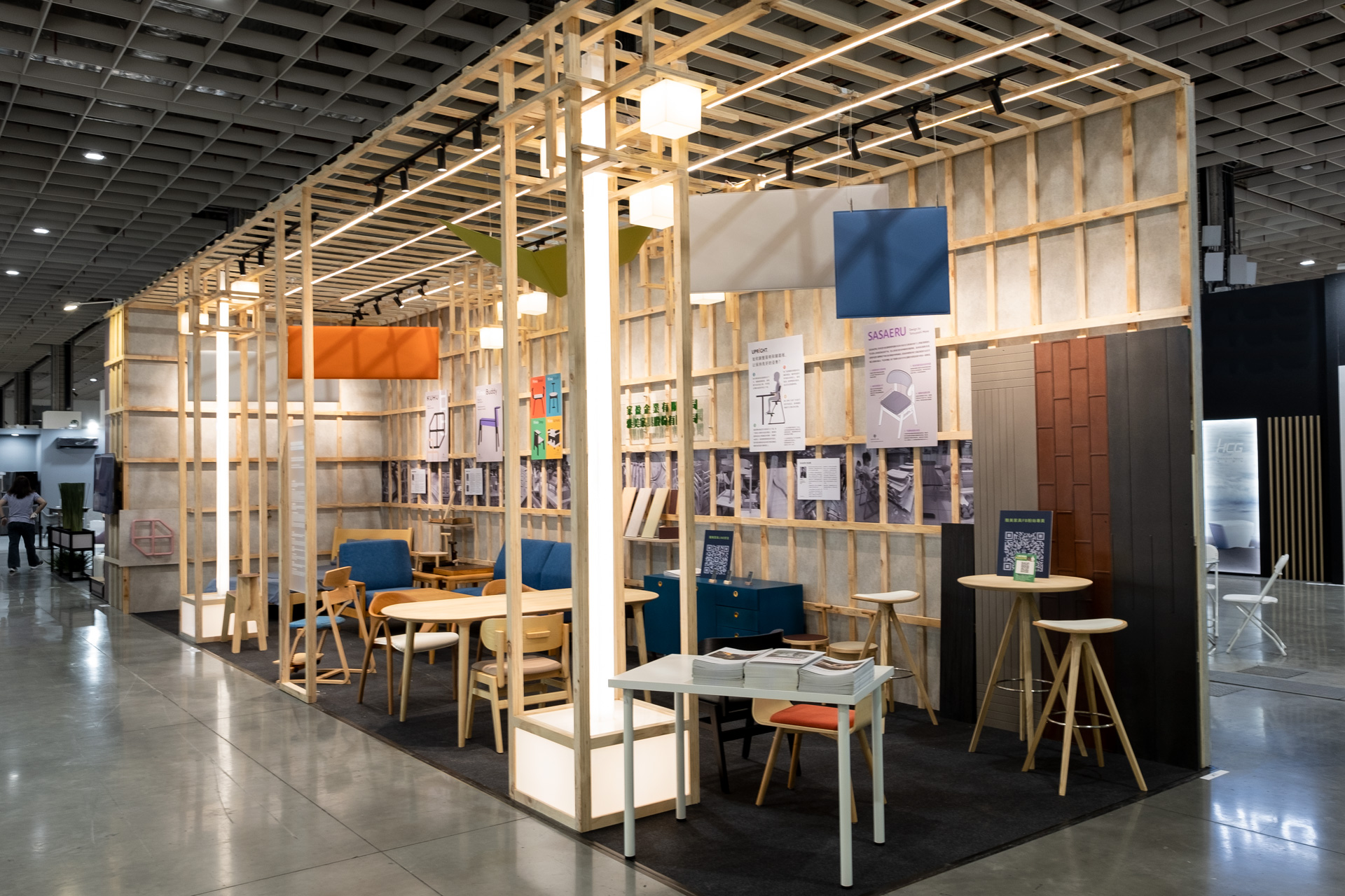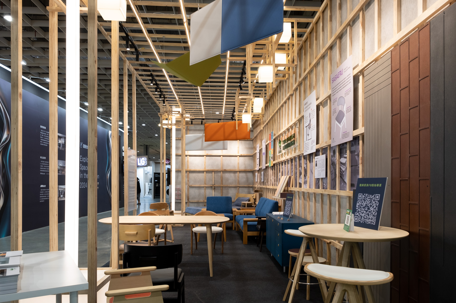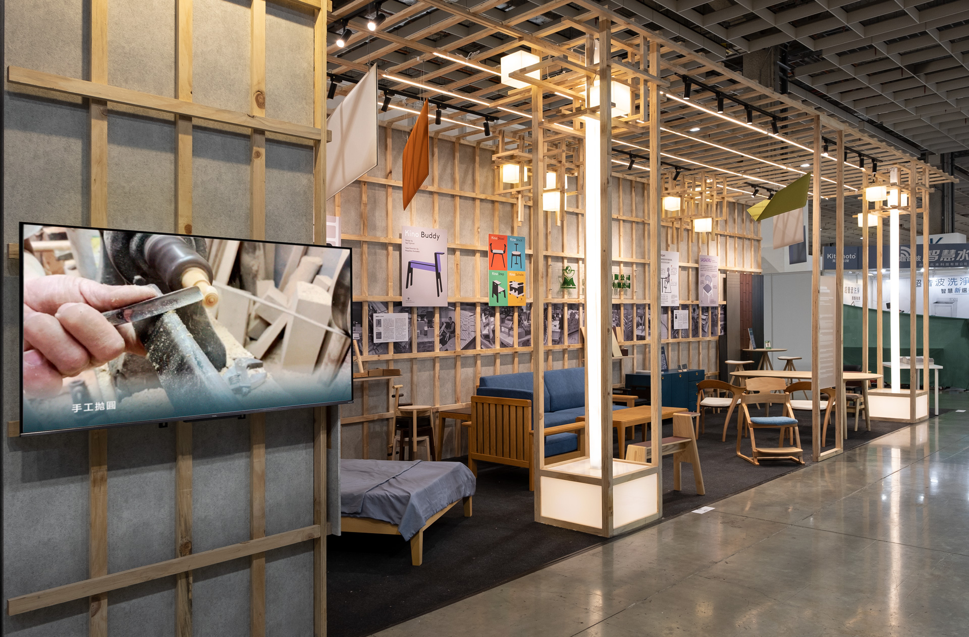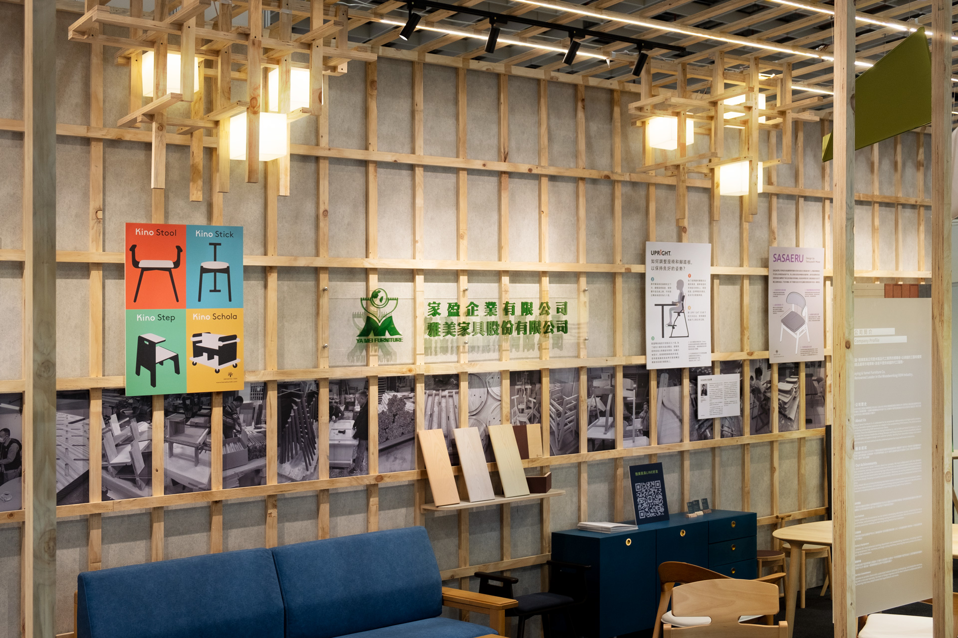 這次為雅美傢俱首次參加建築展的展區攤位,主體以木構設計營造溫暖自然的日式氛圍,並運用堆疊與消隱手法增添空間的立體感和層次感。穿透性燈具提供柔和照明,增強傢俱在展場的和諧感。展區中的木工榫接技法模型與上方面料懸掛,如同和式暖簾(のれん)。透過這些設計元素,參觀者可感受雅美傢俱如日本職人般的工藝精神,以及木製傢俱所展現的質樸與高雅。