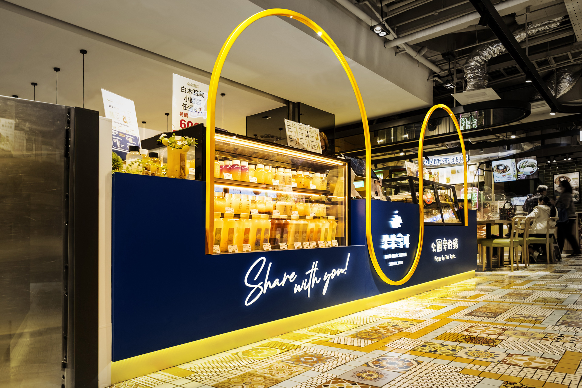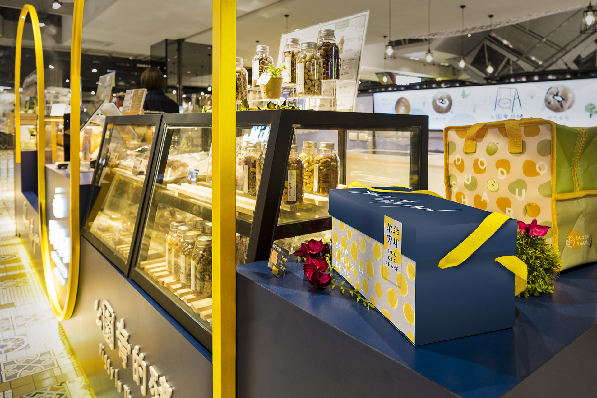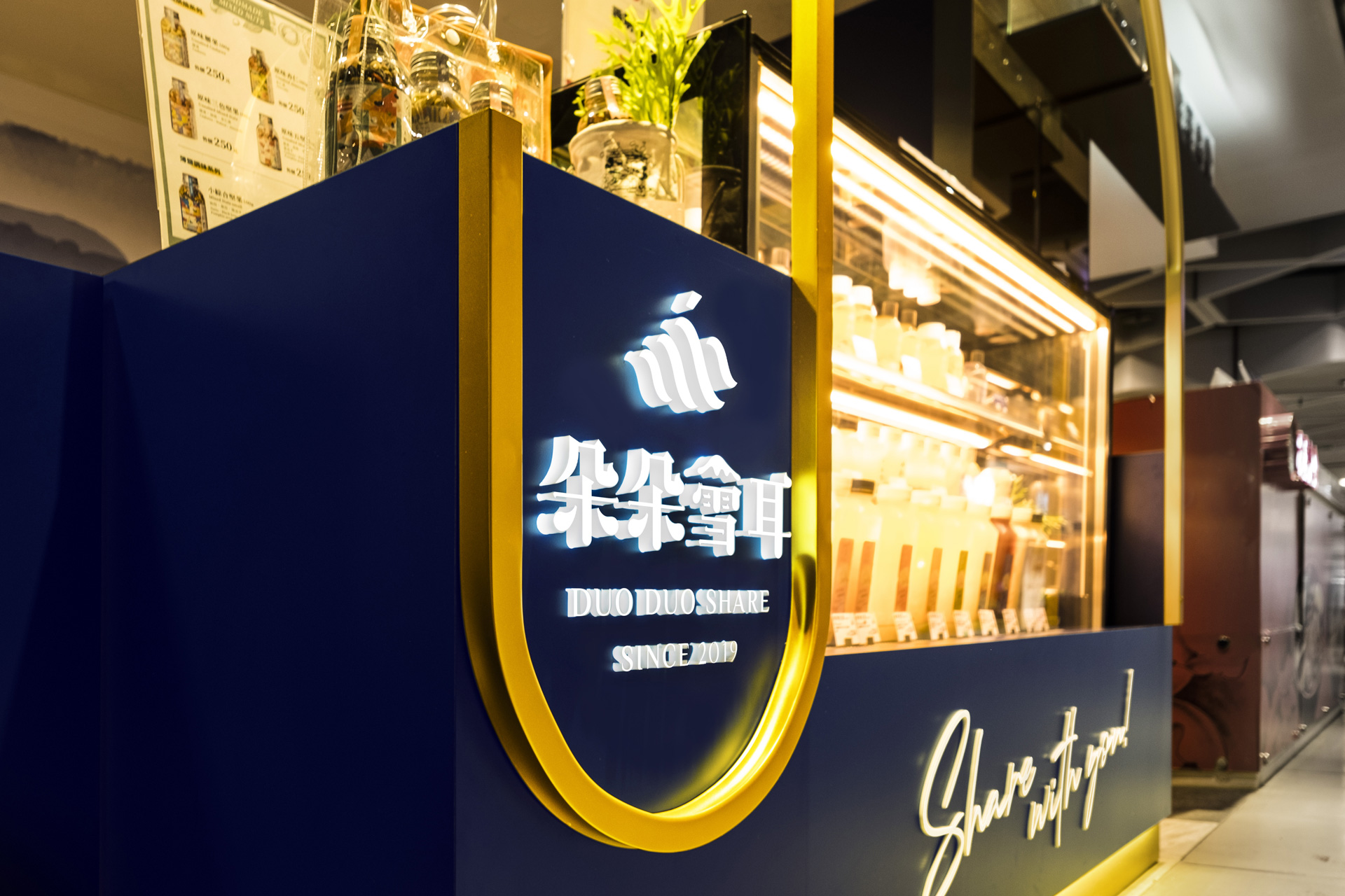 - share 意指著站裏的主打商品"雪耳" , 店名中的"朵朵"上方宛如笑臉,希望客人從看到店名就感受到幸福分享的氣息。品牌主色調的選擇—藍灰色搭配金色,藍灰色帶來了一種平和、沉穩的氛圍,而金色則為品牌增添了一抹高貴和奢華感。這種色彩組合不僅呼應了品牌的基調,也為顧客創造了一個舒適且簡約的環境。